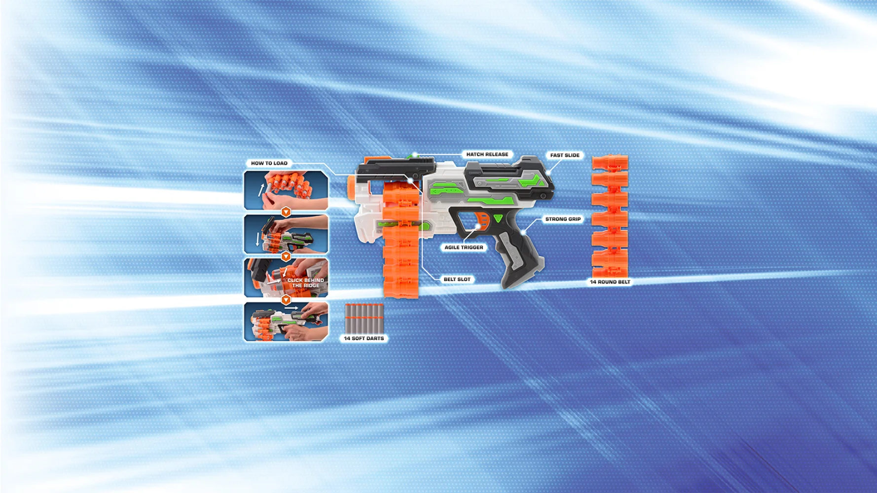 In het heetst van de strijd heb je een blaster nodig waar je snel mee kunt schakelen, zoals de Rattle Belt. De Rattle Belt biedt een laadvermogen van 14 darts en dankzij zijn handige formaat is deze in alle battles goed te gebruiken. De ketting is makkelijk los te halen, te vullen en weer terug te plaatsen. De Rattle Belt wordt geleverd met 14 darts en schiet tot wel 20 meter ver.
